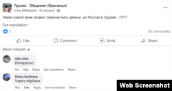 „[მირჩიეთ] რუსეთიდან საქართველოში რომელი ბანკით გადავრიცხო ფული?“ - იკითხა 2025 წლის 18 იანვარს ირინა მიქელაძემ ფეისბუკჯგუფში Грузия - Общение (Оригинал)