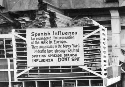 გადაფურთხების ამკრძალავი ნიშანი აშშ-ის გემთსაშენში 1918 წელს. როგორც კი ვირუსმა გავრცელება დაიწყო, მას „ესპანური გრიპი“ დაარქვეს მხოლოდ იმის გამო, რომ ევროპის ქვეყნები მედიაში ინფორმაციის გავრცელებას ომის დროს მკაცრად აკონტროლებდნენ. ესპანეთი კი ნეიტრალური ქვეყანა იყო, ისევე როგორც მისი მედია და სასიკვდილო დაავადებების შესახებ პირველი ცნობები იქიდან წამოვიდა.