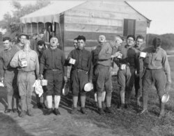 აშშ-ის არმიის ჯარისკაცები და საწვრთნელი კორპუსის სტუდენტები „გრიპის ნიღბებში“. სურათზე 1918 წელია, თანამედროვე ისტორიიის ყველაზე მომაკვდინებელი პანდემიის პიკი.