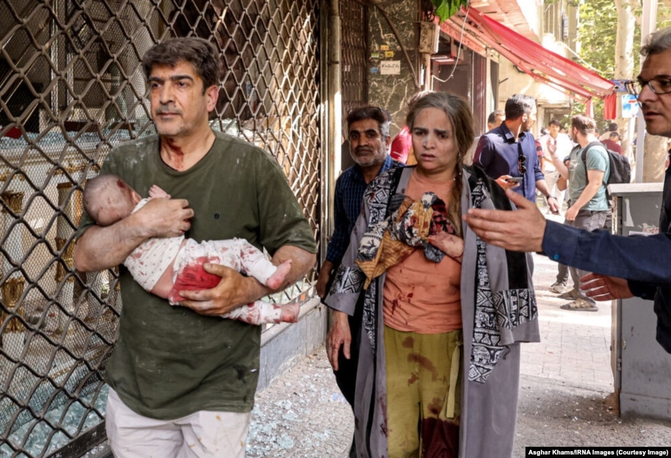 1. 15 ივნისი: კაცს მიჰყავს დაჭრილი გოგო, თეირანის ცენტრში მომხდარი აფეთქების შემდეგ, ისრაელის მიერ ირანის მთელ ტერიტორიაზე არსებულ სამიზნეებზე დარტყმების დროს.