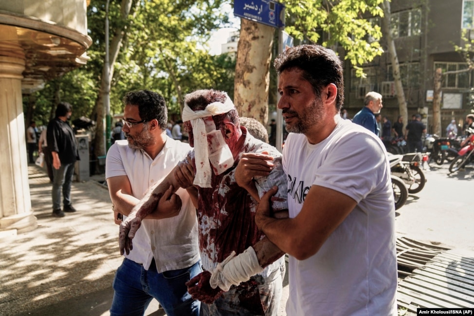 5. 15 ივნისი: ხალხი დაჭრილ კაცს ეხმარება, თეირანის ცენტრში ისრაელის მიერ განხორციელებული დარტყმის შემდეგ.