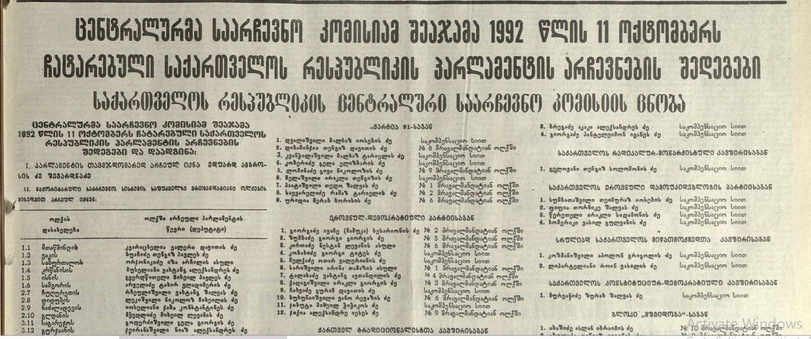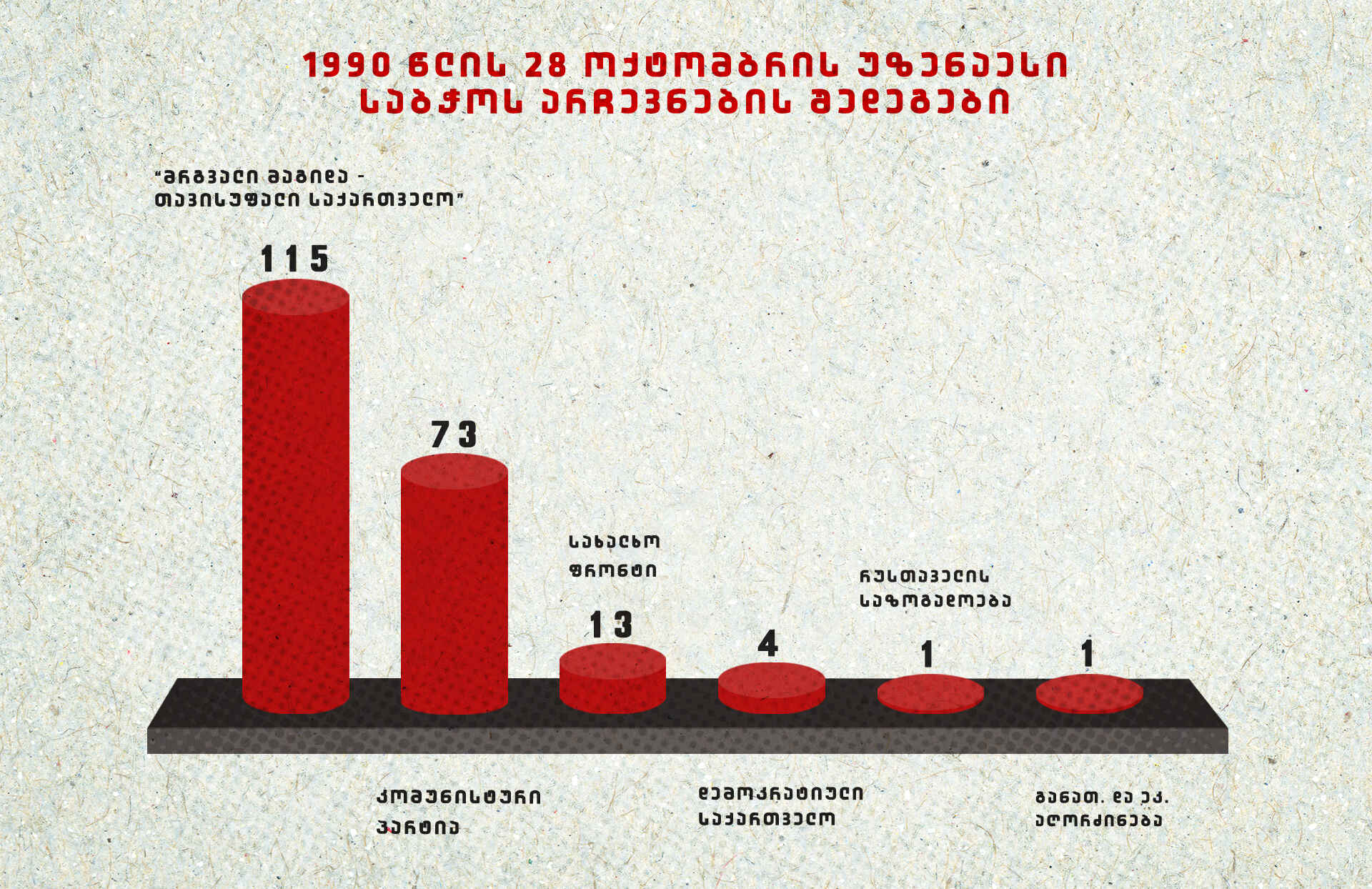 არჩევნების დღემ და შედეგების დაჯამების პერიოდმა მშვიდობიანად ჩაიარა: პირველ მრავალპარტიულ, დემოკრატიულ არჩევნებში 4 %-იანი საარჩევნო ბარიერი მხოლოდ საარჩევნო ბლოკმა „მრგვალი მაგიდა - თავისუფალი საქართველო“ და „კომუნისტურმა პარტიამ“ გადალახეს. ეროვნულმა მოძრაობამ კომუნისტებზე თითქმის ორჯერ მეტი ხმა მიიღო: