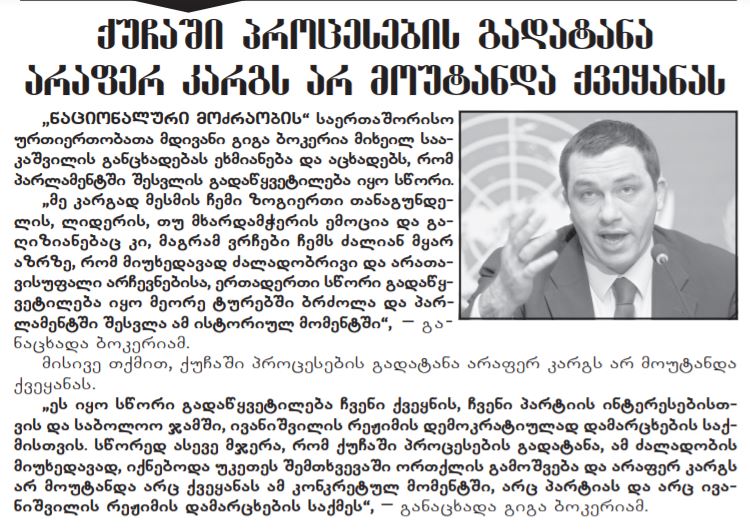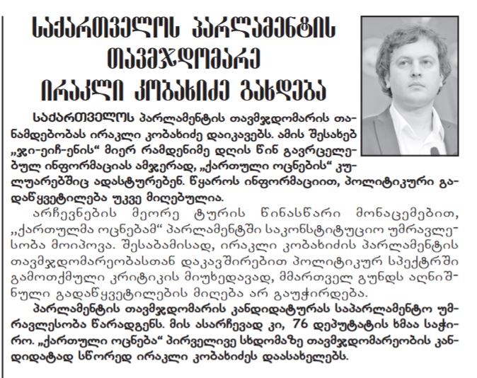„ქართული ოცნება” იყო ერთადერთი, რომელიც შეთანხმებას ასრულებდა. თუმცა დღეს ხელშეკრულება ანულირებულია. დოკუმენტმა თავისი მისია შეასრულა და თავი ამოწურა. მიუხედავად იმისა, რომ ოპოზიციონერი დეპუტატების ნახევარზე მეტს შეთანხმებაზე ხელი არ მოუწერია, ვხედავთ, რომ ჩვენი საერთაშორისო პარტნიორები საჭიროდ არ თვლიან, რადიკალურ ოპოზიციას დოკუმენტის ხელმოწერა და მის აღსრულებაში მონაწილეობა მკაცრად მოსთხოვონ. თვითმმართველობის არჩევნების ჩატარება იმ პოლიტიკური შეთანხმების ფონზე, რომელსაც მთავარი ოპოზიციური პარტია ხელს არ აწერს, ქვეყნის ინტერესებისთვის დამაზიანებელია. ამ ვითარებაში “ქართული ოცნების“ მხრიდან შეთანხმების ამოწურულად გამოცხადება უალტერნატივო ნაბიჯად გვესახება“, - ირაკლი კობახიძე