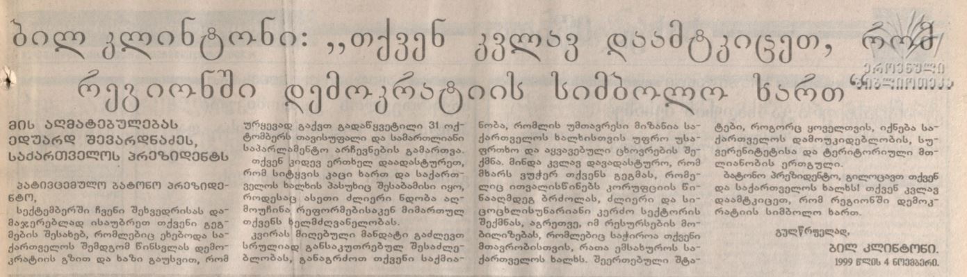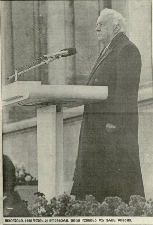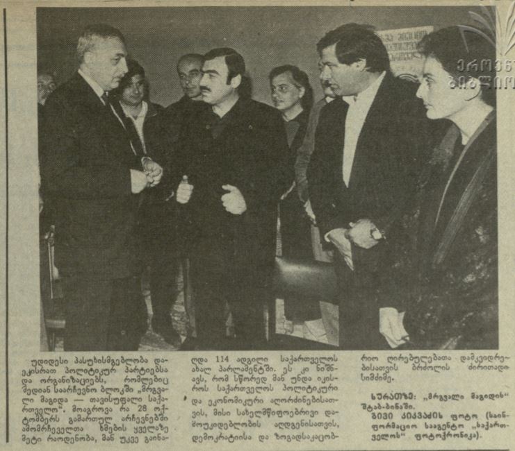 „28 ოქტომბერი საქართველოს ისტორიაში ერთ-ერთი უმნიშვნელოვანესი დღეა. ქართველ ერს პირველად მიეცა საშუალება თავისუფლად გამოეხატა დამოკიდებულება იმ რეჟიმისადმი, რომელიც გამეფებული იყო საქართველოში უკანასკნელი 70 წლის განმავლობაში და მან სავსებით ცალსახად გააკეთა თავისი არჩევანი... მინდა მივულოცო გამარჯვებულს ის ნდობა და ტვირთი, რომელიც მან მიიღო საქართველოს მოსახლეობისგან. ამჟამად ყველაზე მნიშვნელოვანია ყველამ ვიგრძნოთ პასუხისმგებლობა - ვინც პარლამენტში შევიდა და ვინც დარჩა პარლამენტს გარეთ. ყველამ უნდა ვიპოვოთ საკუთარი ადგილი“.