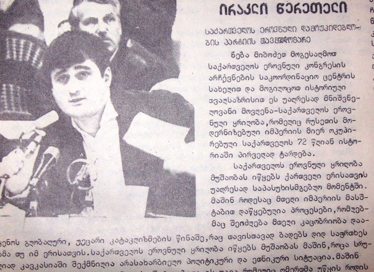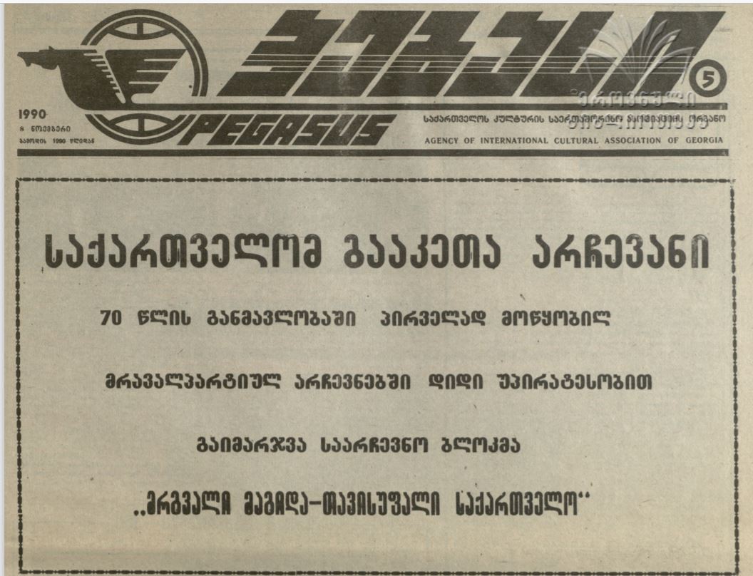 „საქართველოში პირველად უნდა გაიმართოს მრავალპარტიული არჩევნები! ვისი გამარჯვებაა არჩევნებში სასურველი - რუსთაველის საზოგადოების? სახალხო ფრონტის? მრგვალი მაგიდის? მწვანეების? ფედერალური პარტიის? დასის? არც ერთის! მრავალპარტიულ არჩევნებში უნდა გაიმარჯვოს საქართველოს ეროვნულმა მოძრაობამ! ეს გამარჯვება ნიშნავს უზენაესი საბჭოს გარდაქმნას ჭეშმარიტ პარლამენტად და საქართველოს პოლიტიკური დამოუკიდებლობის აღდგენის რეალურ არგუმენტს.