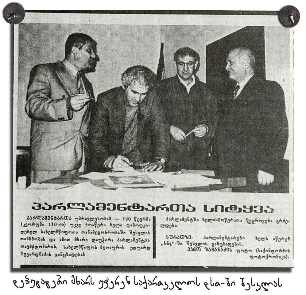 14 ნოემბერი. 10.00 საათი. საქართველოს უზენაესი საბჭოს სხდომათა დარბაზში მუშაობას შეუდგა პირველი მოწვევის უზენაესი საბჭოს პირველი სესია.
