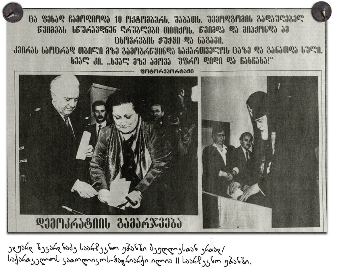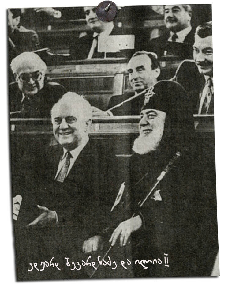 „70 წლის განმავლობაში პირველად ერის ბედის გადასაწყვეტად შეიკრიბნენ ერის მიერვე არჩეული და მისი ნდობით აღჭურვილი ადამიანები. უმაღლესი საკრებულო დალოცა უწმინდესმა და უნეტარესმა, საქართველოს კათოლიკოს-პატრიარქმა ილია მეორემ, რომელმაც საქართველოს უზენაეს საბჭოს გადასცა „ბიბლია“ და იერუსალიმიდან ჩამოტანილი და უფლის საფლავზე ნაკურთხი ამაღლების ხატი. ერთხმად იქნა არჩეული საქართველოს უზენაესი საბჭოს თავმჯდომარედ ბატონი ზვიად გამსახურდია“.