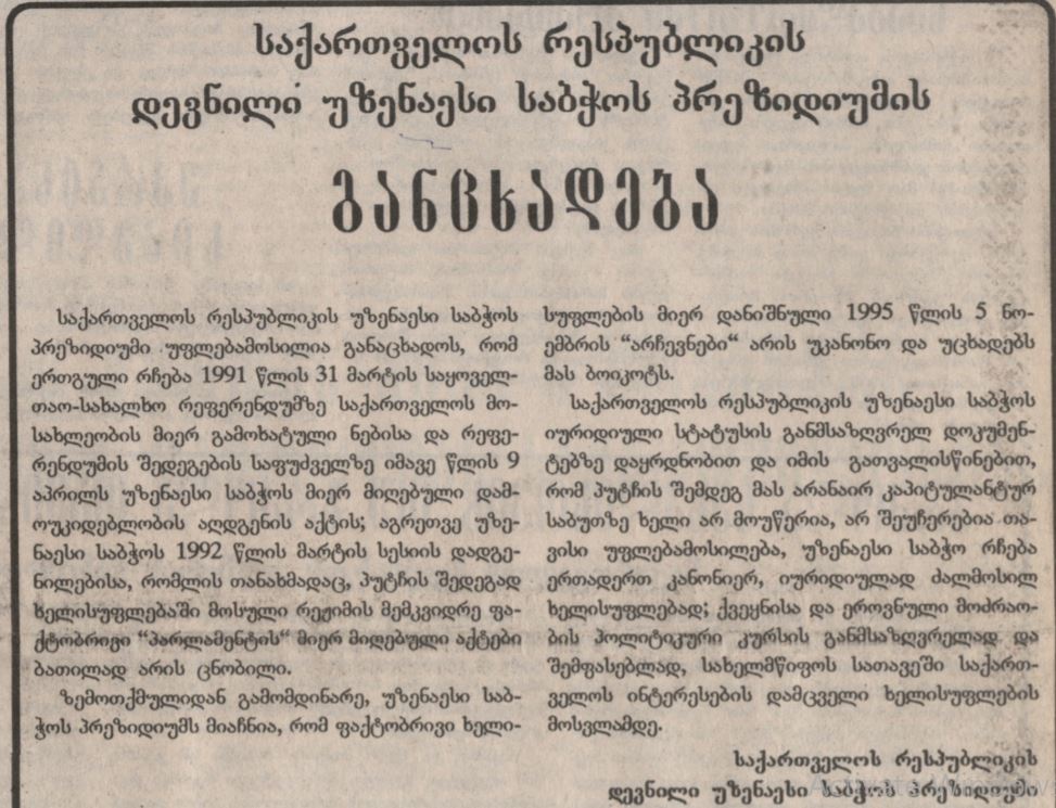 „ჩვენდამი ოპოზიციურად დაპირისპირებული ბანაკიდან გაისმის მოწოდება, რომ თითქოს ჩვენ საქართველო დაუყოვნებლივ უნდა გამოვაცხადოთ კოლონიურ ქვეყნად, ხოლო ჩვენი თავი - კოლონიური თვითმმართველობის ორგანოდ, რაც არ მიგვაჩნია მართებულად, ვინაიდან მსოფლიო ისტორიას არ ახსოვს კოლონიური სტატუსის ქვეყანა, სადაც ჩატარებულიყოს თავისუფალი, მრავალპარტიული არჩევნები და ეს ქვეყანა ამის შემდეგაც კოლონიად დარჩენილიყოს... საქართველო აღარ არის კოლონია, მაგრამ არც დამოუკიდებელი სახელმწიფოა ჯერჯერობით. ეროვნული ხელისუფლება კი იმის გამო ავირჩიეთ, რომ ჩვენს ქვეყანაში დაიწყოს ანექსიის შედეგების ლიკვიდაცია და აღდგეს დამოუკიდებლობა“.