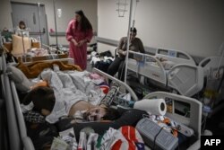 ბავშვები, რომლებიც პედიატრიულ განყოფილებაში მკურნალობდნენ, ჩაიყვანეს საავადმყოფოს სარდაფში, რომელსაც ბომბსაფრად იყენებენ. კიევი. 28 თებერვალი.