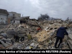 მაშველები მუშაობენ დაბომბვის დროს განადგურებული შენობების ნანგრევებში. ჟიტომირი. 7 მარტი