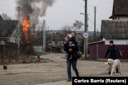ადგილობრივი მცხოვრებლები გარბიან ქალაქ ირპენიდან დაბომბვის დროს. 6 მარტი