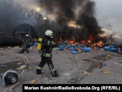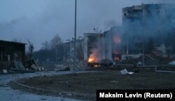 მეხანძრეები აქრობენ დაბომბვით გამოწვეულ ხანძარს. ჩუგუივი. 24 თებერვალი.