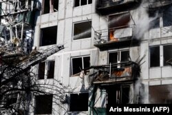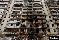 დაბომბვის შედეგად დაზიანებული საცხოვრებელი კორპუსი კიევში. 26 თებერვალი.
