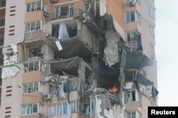 სარაკეტო თავდასხმის შედეგად დაზიანებული საცხოვრებელი კორპუსი კიევში. 26 თებერვალი.