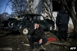 კაცი ზის დაბომბვის შედეგად დანგრეული შენობის წინ. ჩუგუივი. 24 თებერვალი.
