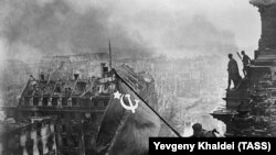 ჰიტლერის გვამის დაწვიდან 7 საათის შემდეგ გენერალ კუზნეცოვის მესამე არმიის ორი სერჟანტი რაიხსტაგზე წითელ დროშას ააფრიალებს. ფოტოგრაფი ევგენი ჰალდეი ისტორიისთვის აღბეჭდავს ამ მომენტს. თუმცა, ფოტოს რეტუშირება დასჭირდება - ერთ-ერთი სერჟანტის მაჯაზე საათები ისე იყო ახუნძლული, როგორც მწვადი შამფურზე.