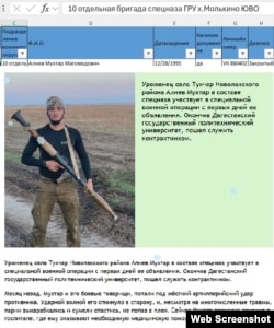 ბაზაში გვხვდება სამხედროები, რომლებზეც მედია წერდა. მაგალითად, ნოვოლაკსკის რაიონის (დაღესტანი) მკვიდრი მუჰთარ ალიევი. მასზე 2022 წლის დეკემბერში „დროის ხმა“ იტყობინებოდა, რომ სროლაში მოყვა, მაგრამ გადარჩა. ბაზა შესაძლებლობას გვაძლევს გავიგოთ, რომ ის ერთი თვით ადრე დაიჭრა და კრასნოდარის 419-ე ჰოსპიტალში დააწვინეს დიაგნოზით: „ცხვირის ძვლების დახურული მოტეხილობა“. მონაცემთა ბაზიდან ირკვევა, რომ ალიევი, ისევე როგორც კიდევ ას კაცამდე, სამხედრო დაზვერვაში მუშაობდნენ, რუსეთის გენშტაბის მთავარი სამმართველოს სპეცრაზმის გარკვეულ ბრიგადაში. ბრიგადა კრასნოდარის მხარის ხუტორ მოლკინოში იყო დისლოცირებული.
