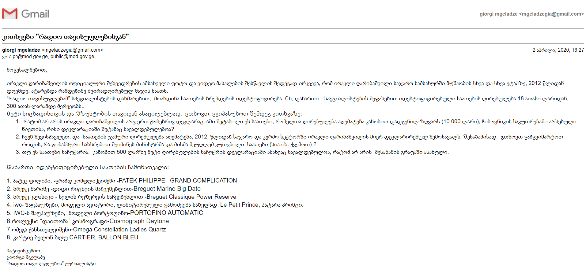 როდის, რა ფინანსებით შეიძინა ძვირფასი საათები და რატომ არ აქვს ასახული ქონებრივ დეკლარაციაში ამის შესახებ თავდაცვის მინისტრს ორი კვირის წინ ოფიციალურად ვკითხეთ, თუმცა არ გვიპასუხა. ეს საათები საჩუქარიც რომ იყოს, კანონით დეკლარაციაში აუცილებლად უნდა აესახა და მჩუქებელიც უნდა დაესახელებინა, თუმცა თავდაცვის მინისტრის დეკლარაციებში ეს გრაფაც ცარიელია.