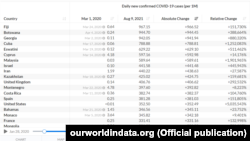 მსოფლიო შედეგებით, სიტუაცია საქართველოში აფრიკისა და წყნარი ოკეანის რამდენიმე სახელმწიფოს შორის ხვდება. მაჩვენებლებში ჯერ კიდევ არ არის ასახული 10 აგვისტოს სტატისტიკა - ბოლო 24 საათში გამოვლენილი 5 697 ახალი შემთხვევა და 54 გარდაცვლილი პაციენტი.