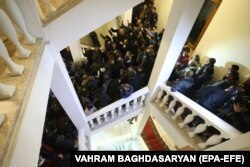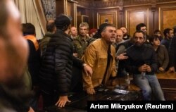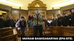 დემონსტრანტები ყვირიან პარლამენტის შენობაში. პარლამენტის სპიკერი, არარატ მირზოიანი, საპროტესტო გამოსვლის დროს მასზე თავდასხმის შემდეგ საავადმყოფოში გახდა გადასაყვანი.