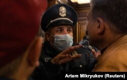 პოლიციელი დემონსტრანტებს ესაუბრება პარლამენტის შენობაში.