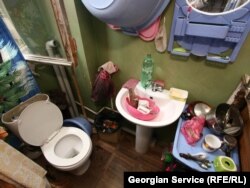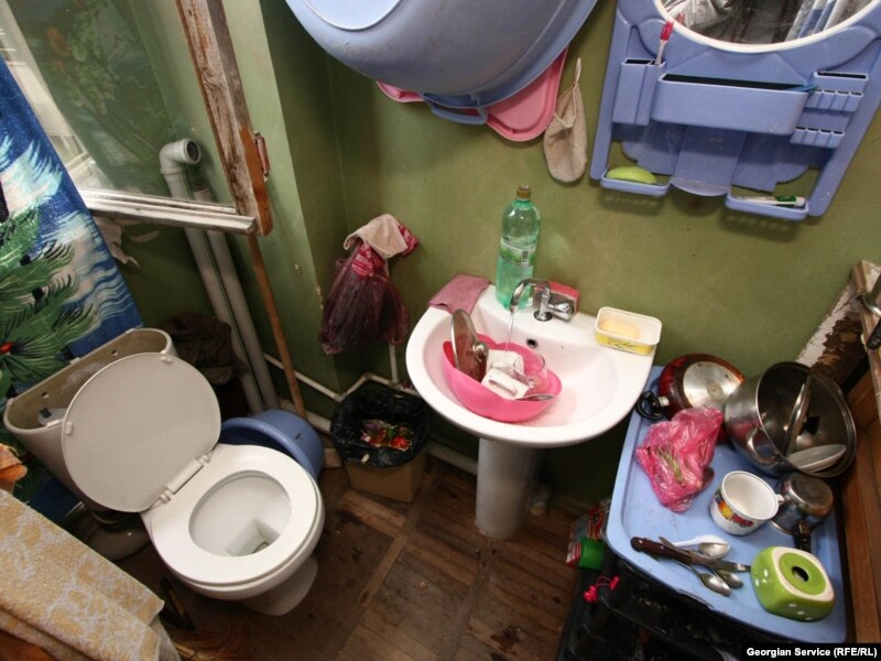 ნინო ხარაძე: “საცხოვრებელ ოთახებში ღია წესით მოწყობილია საპირფარეშო, რომელიც თავად დევნილებმა ფარდებით ან კარადებით გადატიხრეს, დერეფნებში ყრია სამშენებლო ნარჩენები, დგას მტვერი.“