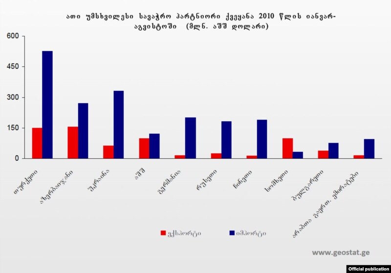 ათი უმსხვილესი სავაჭრო პარტნიორი ქვეყანა 2010 წლის იანვარაგვისტოში