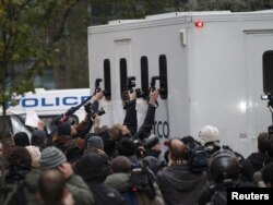 ლონდონი: ფოტოგრაფები ცდილობენ, სურათები გადაუღონ პოლიციის მანქანაში მყოფ პირებს, რომელთა შორისაც 7 დეკემბერს დაპატიმრებული ჯულიან ასანჟიც ეგულებათ
