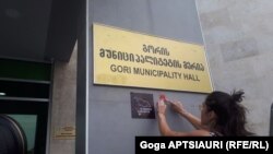 აქციის მონაწილეებმა მერიის კედლებზე გააკრეს სტიკერები წარწერით - „საქართველოს 20 პროცენტი ოკუპირებულია რუსეთის მიერ“.