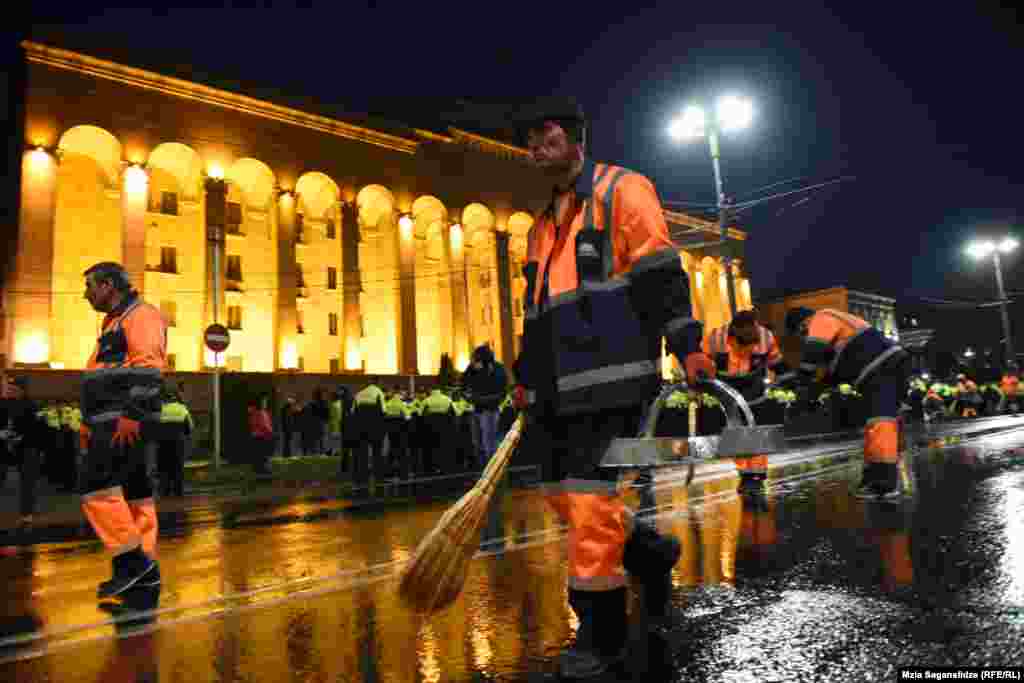 სამართალდამცველებმა პარლამენტის წინ, გზის სავალი ნაწილი კარვებისგან გაათავისუფლეს, რუსთაველის გამზირი კი დასუფთავების სამსახურის წარმომადგენლებმა დაალაგეს.