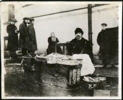 შიმშილით დაქანცული რუსი გლეხი არხანგელსკში აშშ-ის შტაბის კიბეებზე ისვენებს.