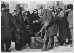ბოლშევიკ პატიმრებს ამერიკელი ჯარისკაცი ბრინჯს აჭმევს. 1919 წლის იანვარი.