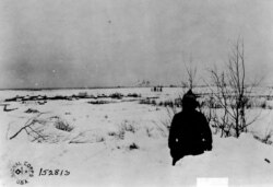 ამერიკელი სამხედრო გასცქერის ბოლშევიკების დაკავებულ სოფელ შენკურსკს. ამერიკული პოზიცია ბოლშევიკებმა ფოტოს გადაღებიდან ორი კვირის შემდეგ დაიკავეს.