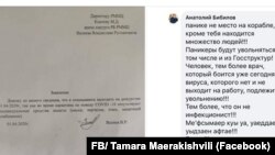 „პანიკის ადგილი არ არის გემზე, სადაც შენ გარდა სხვა ბევრი ადამიანია. პანიკიორებს სამსახურიდან დავითხოვთ, მათ შორის, სახელმწიფო სტრუქტურებიდან. ადამიანი, მით უმეტეს ექიმი, რომელსაც უკვე დღეს ეშინია ვირუსის, რომელიც არ არის და არ გამოდის სამსახურში, გათავისუფლებას ექვემდებარება. მით უმეტეს, რომ ის არ არის ინფექციონისტი“, - წერს ანატოლი ბიბილოვი.