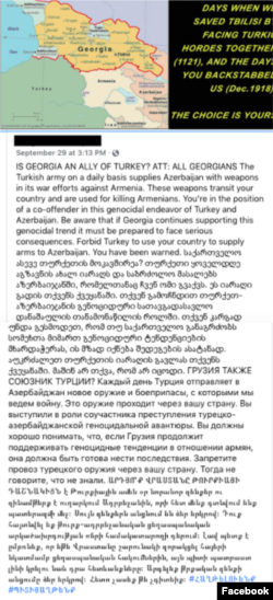 - 4 ოქტომბერს ვრცელდებოდა დასპონსორებული პოსტი, ნახატით, სადაც ახალქალაქი და ახალციხე წითლად არის მონიშნული, და დეზინფორმაციული ტექსტით “Akhalkalaki is Armenia. Akhaltsikhe is Armenia”. პოსტს ავრცელებდა 29 სექტემბერს შექმნილი გვერდი, რომელსაც სხვა კონტენტი განთავსებული არ აქვს, რაც ქმნის შთაბეჭდილებას, რომ აღნიშნული გვერდი სწორედ მსგავსი პროვოკაციული პოსტის გასავრცელებლად შეიქმნა.