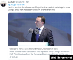 საქართველოს მთავრობის გადაწყვეტილებას სოციალურ ქსელ ტვიტერზე აშშ-ის ყოფილი ელჩი საქართველოში, იან კელიც გამოეხმაურა. ის წერს, რომ „საქართველოს დასავლეთზე ორიენტირებული რეფორმებისგან აშორებს საქართველოს ხელისუფლების გადაწყვეტილება უარი თქვას ევროკავშირის მაკროფინანსური დახმარების მეორე ნაწილის აღებაზე“.