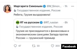 რუსეთის პროპაგანდისტული, ინგლისურენოვანი ტელეარხის, RT-ის მთავარმა რედაქტორმა მარგარიტა სიმონიანმა ღარიბაშვილის ციტატა გააზიარა და დაწერა, რომ "საქართველო გამოჯანმრთელდა", რასაც ასევე მოჰყვა რუსეთის პოლიტიკის მომხრეთა შეფასებები, მისი ტვიტერისა და ტელეგრამის გვერდებზე: