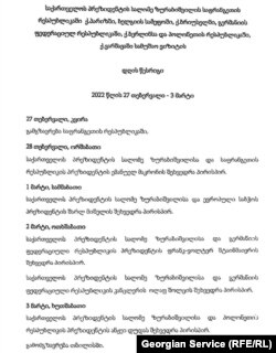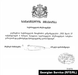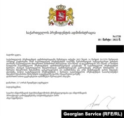 "გიგზავნით საქართველოს მთავრობის განკარგულებას 2022 წლის 27 თებერვლიდან 3 მარტის ჩათვლით საქართველოს პრეზიდენტის სამუშაო ვიზიტებთან დაკავშირებულ წინადადებაზე უარის შესახებ", - წერია 26 თებერვლით დათარიღებულ დოკუმენტში, რომელსაც პრემიერი ირაკლი ღარიბაშვილი აწერს ხელს.