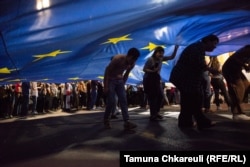 ეს აქციაც, წინა ორის მსგავსად, ხალხმრავალი იყო. ევროკავშირის დროშა აქ ყველა თაობის ადამიანს ეჭირა - ატლასის უზარმაზარი ალამიც და სულ პატარა, აქვე გაშლილ დახლებზე ნაყიდი ქაღალდის დროშებიც. ყველაზე მეტი მაინც სტუდენტია, აქციას ახალგაზრდები 15-ზე მეტი სასწავლებლიდან შეუერთდნენ.