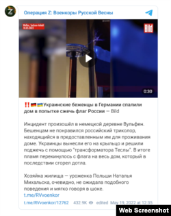 ივნისში არაერთმა პროკრემრისტულმა ტელეგრამ-არხმა დაწერა, რომ გერმანიაში უკრაინელმა ლტოლვილებმა ცეცხლი წაუკიდეს სახლს, რომელზეც რუსული დროშა ეკიდა. შეტყობინებებს თან ერთვოდა ვიდეოც, რომელსაც გერმანული ტაბლოიდის, ბილდის ლოგო ედო და სადაც ალმოკიდებული სახლი ჩანდა.