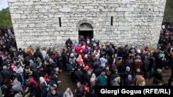 ეკლესიის ეზო უკვე სავსეა. ვინც უკვე გადაჭედილ ეკლესიაში შესვლა მოასწრო, წირვას უსმენს, დანარჩენები კი ირგვლივ ჯგუფ-ჯგუფად არიან შეკრებილები.