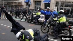 პოლიციელი მიწაზე ვარდება, მეორე კი პილპილის აეროზოლს ასხამს დემონსტრანტებს, რომლებიც ვაშინგტონში მართავენ აქციებს აშშ-ის პრეზიდენტ დონალდ ტრამპის წინააღმდეგ.