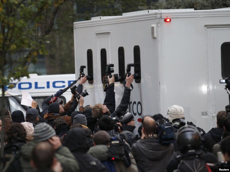 ლონდონი: ფოტოგრაფები ცდილობენ, სურათები გადაუღონ პოლიციის მანქანაში მყოფ პირებს, რომელთა შორისაც 7 დეკემბერს დაპატიმრებული ჯულიან ასანჟიც ეგულებათ