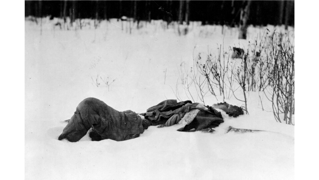 ამერიკელი სამხედრო გასცქერის ბოლშევიკების დაკავებულ სოფელ შენკურსკს. ამერიკული პოზიცია ბოლშევიკებმა ფოტოს გადაღებიდან ორი კვირის შემდეგ დაიკავეს.